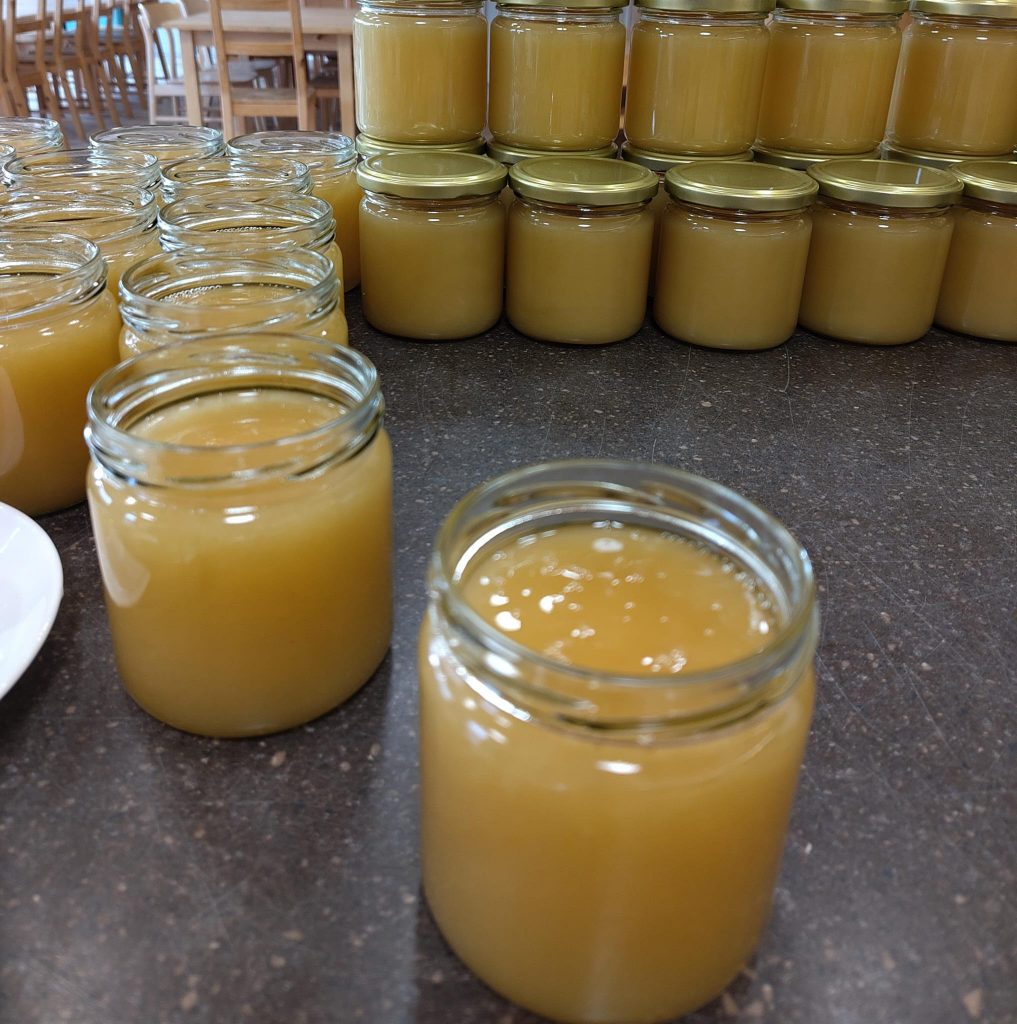 diese Woche mussten wir leider unser Schwein Giacomo schlachten lassen. Er hatte eine Fußverletzung, die nicht mehr gut geworden wäre und konnte nicht mehr schmerzfrei laufen. Bei soviel Körpergewicht macht das keinen Sinn. Also haben wir uns schweren Herzens entschieden ihn zu Jens ins 7 Minuten entfernte Deggendorf zu bringen, um ihn von ihm transformieren zu lassen. Wir haben ihn selbst in aller Ruhe auf den Hänger drauf- und wieder abgeladen und waren dabei als Jens ihn übernommen hat, so dass wir sagen können, es hätte nicht besser sein können. Beim Abholen des transformierten Giacomos heute haben wir kurz auch die Tierärztin getroffen, die bei Jens zur Fleischbeschau war. Im Gespräch haben Jens und sie dann gefragt: „Wie alt war euer Schwein jetzt?“. Wir: „Erst 13 Monate“. Tierärztin und Jens große Augen: „Äh, na sas ist eh mehr als doppelt so alt wie alle andern Schweine…“ Ach ja stimmt. So sind halt die Blickwinkel verschieden. Jens hat die Fleischqualität gelobt und gemeint, wir hätten ihn ruhig noch fetter füttern können. Er sei kaum fett gewesen. Aha, wir hatten schon vorher mit ihm überlegt, was man mit Unmengen von Schweinefett machen könnte. Tja, auch der Metzger sieht erst nach dem Schlachten wie fett ein Schwein wirklich ist. So viel gelernt haben wir wieder 🙂 Jedenfalls haben wir soviel Gläser, dass wir die gerne mit euch teilen und in die Weihnachtskisten geben können.